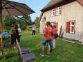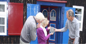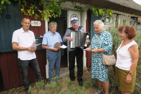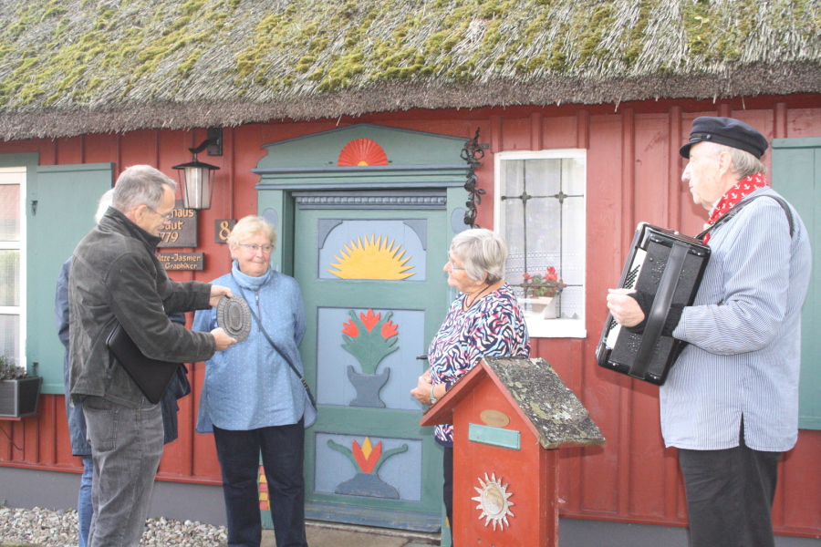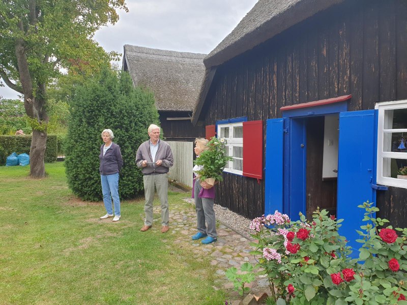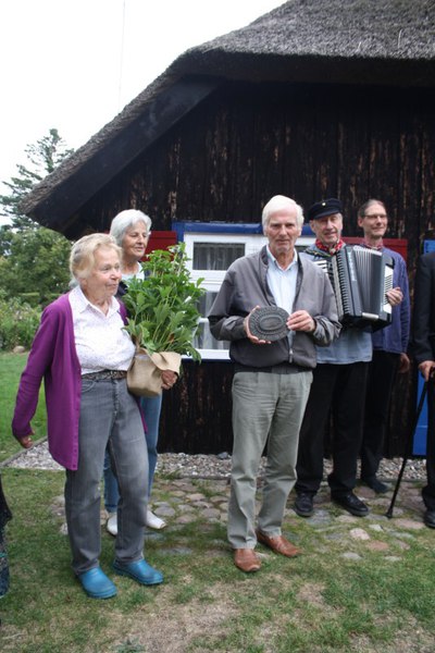 Am Müggenberg in Wieck empfingen Hans Rahnenführer und Elke Erdmann die Mitglieder des Vereinsvorstandes sehr herzlich. Im Vorgarten überreichte René Roloff die edle Bronzeplakette. Ein plattdeutsches Lied begleitete Herr Honig auf dem Akkordeon. Der Hausherr führte die Gruppe durch das sorgsam renovierte kleine Darßhaus und den dahinterliegenden erquickenden Garten. In allem steckt sichtbar viel Liebe und Fleiß.