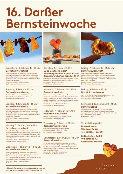 Trotz geschlossener Ausstellung lädt das Darß-Museum in der ersten Winterferienwoche wieder zum Erlebnisprogramm rund um das „Gold des Meeres“ mit Bernsteinwanderungen, Bernsteinworkshops, Vorträgen, Geschichten ein. Abschließender Höhepunkt wird am 10. Februar der Bernstein-Tanz im Saal des Kulturkatens sein.