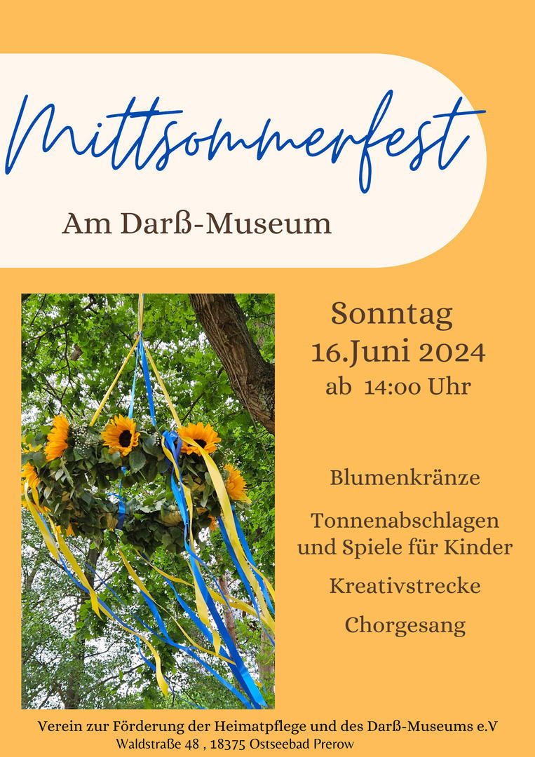 Der Verein zur Förderung der Heimatpflege und des Darß-Museums e. V. lädt wieder ein zum Mittsommerfest im Museumsgarten mit Blumenkränzen, traditionellem Handwerk, alten Kinderspielen, Musik und kulinarischen Köstlichkeiten.