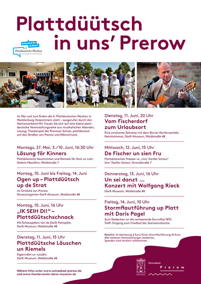 Tau de Plattdüütschen Wochen MV gifft dat eene Plattddüütsche Themenwoch in Prerow. De aktiven Plattdüütschen rund üm dat Darß-Museum hem een Programm up korte un grote Bein stellt